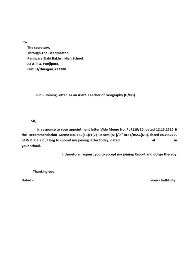 Dear madam through some reliable source i have come to know about the vacancy of teacher available in your prestigious institution. Employees joining report. These sample joining letter formats are applicable for a teacher employee official job marketing job or any entry level job joining request letter by teacher to principal. You can use this appointment letterjob offer letter for pre school teacher junior teacher senior teacher subject teacher or class teacherrules salary and timings can be mentioned accordingly.